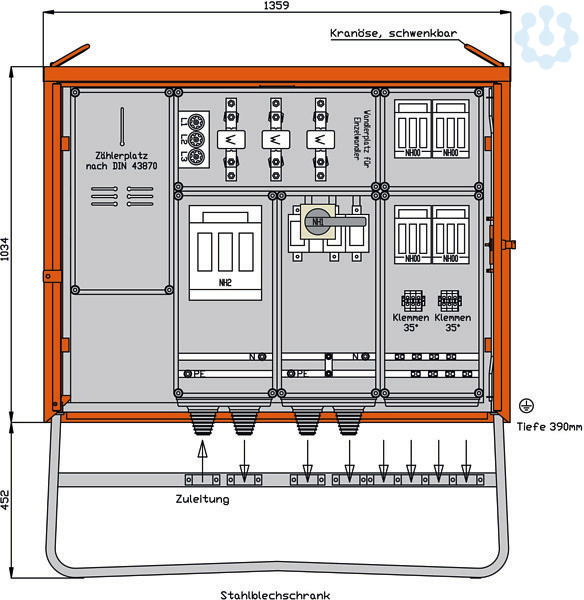 inkl. feuerverzinktem Untergestell mit Ösen für Erdnägel Einbauten im Isolierstoffgehäuse Schutzart : IP 44 Messeinrichtung Schutzart : IP 54 Größe ca.: 1034 x 1359 x 390mm / H-B-T + Untergestell-Höhe ca.: 452mm