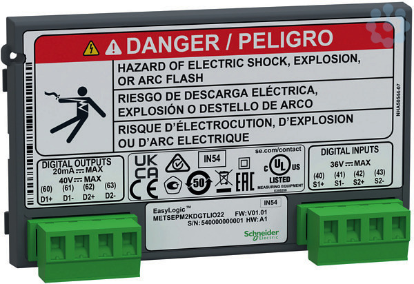 Analog-E/A-Optionsmodul, das mit den PowerLogic PM2x30 Geräten kompatibel ist und zusätzliche analoge Ein- und Ausgänge bietet. 2 Digitaleingänge für Statusmeldung oder Impulszählung(36 V DC), Aus: 0 - 4 V / Ein: 18 -36 V. 2 Digitalausgänge (Transistor) als Impulsausgang, Steuerkontakt oder Alarmkontakt (Lastspannung: ? 40 V DC. Laststrom:? 20 mA) Hinweis: Ausgang hat negative Logik d.h.Spannungsquelle muss parallel zur Last geschaltet werden. Die Optionsmodule werden auf der Rückseite des Zählers angebracht und dienen zum Anschluss der Steuerspannung und des Schnittstellenbusses. Die PowerLogic-Geräte PM2x30 erlauben maximal 1 Ein-/Ausgangs-Optionsmodul pro Zähler.