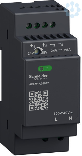 Spannungsversorgung Modicon der Baureihe MODULAR für Anwendungen in der Industrie sowie Gewerbe- und Wohngebäude. Ausgang mit 24V/1,2A. Nennleistung 30W. Kunststoffgehäuse zur Aufrastung auf einer Hutschiene oder aufschraubbar auf Montageplatte. Arbeitsprinzip elektronische Taktung. Mögliche Betriebstemperatur bis +70°C. Gehäusefarbe ist dunkelgrau. Eingang unten, Ausgänge oben am Gerät. Eingangsspannung 100-240 VAC (50/60 Hz). Zugang zu Dokumentation per QR-Code auf dem Gerät. IEC/EN 62368-1 konform, CE, CB-Scheme,cULus,cURus,RCM,EAC. Die Baureihe Modicon ABLM Modular umfasst Spannungsversorgungen mit Ausgangsspannungen von 5VDC, 12VDC oder 24VDC.