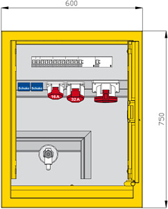 Verteilerschrank 277kVA mit RCD Typ B, 2 LS, 1 CEE-Abgang 32A, einer S