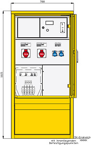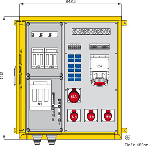 Verteilerschrank 44kVA mit 2 RCDs T yp B, 3 LS, 2 CEE-Abgänge 32-63A un