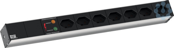 19° 1HE ALU Steckdosenleiste 7xCH Typ 13 90° schwarz, mit Thermosicherung 10A mit Überspannungsschutz, 2,0m H05VV-F3G1,00mm² mit T12 Stecker schwarz. wiederanschließbar. 19° Endkappen + Winkel. mit Bachmann Bedruckung. im Polybeutel.