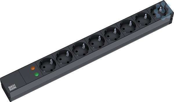 19° - Steckdosenleiste ALU 1HE 8-fach Schutzkontaktsteckdosen schwarz mit Überspannungsschutz 6,5kA ( ÜSS ). Profil: ALU 1HE schwarz Länge:438,5mm. Endstücke genietet, nicht öffenbar. 2m H05VV-F 3G1,50mm²schwarz mit Schutzkontakt- winkelstecker. inkl. Befestigungswinkel mit Schrauben. verpackt im Polybeutel.