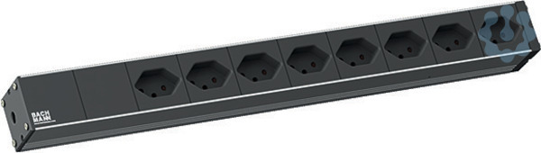 19° 1HE ALU Steckdosenleiste 8xCH Typ 13 90° schwarz, mit Thermosicherung 10A 2,0m H05VV-F3G1,00mm² mit T12 Stecker schwarz. wiederanschließbar. 19° Endkappen + Winkel. mit Bachmann Bedruckung. verpackt im Polybeutel.