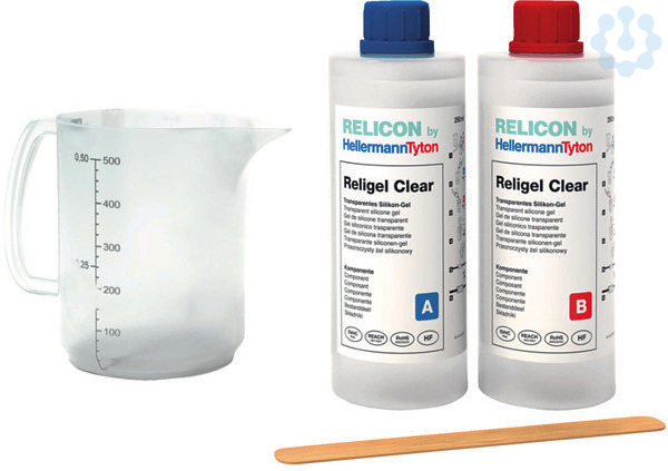 RELICON Religel Clear ist ein transparentes, weich elastisches 2-Komponenten Silikongel. Es wird in transparenten Dosierflaschen oder Kanistern, inkl. Messbecher und Rührstab geliefert. Exzellentes Fließverhalten, Flexibilität durch Entnahme kleinerer Einsatzmengen, Mischungsverhältnis 1:1. Kristallklar aushärtend, elastisch, vibrationsdämpfend, rückstandslos entfernbar. Verbindungen können direkt überprüft werden, der Stichkanal schließt sich wieder. Hervorragende Isoliereigenschaften, Kennzeichnungs-, halogen- und isocyanatfrei, SVHC-frei, enthält keine gefährlichen Substanzen, ausgehärtete Produktreste können im Hausmüll entsorgt werden. Zur elektrischen Isolierung im Niederspannungsbereich, in Abzweigdosen, in Platinen-Vergusstechniken, im Modellbau, im Erdreich, in Hobbyinstallationen.