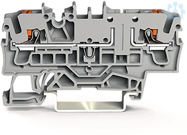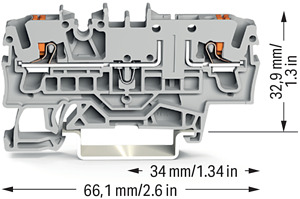 2-Leiter-Basisklemme. mit Drücker. für Tragschiene 35 x 15 und 35 x 7,5. 2,5 mm². Push-in CAGE CLAMP®. 2,50 mm². grau