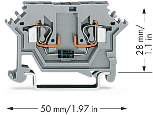 Bauelementklemme. 2 Leiter. mit Diode 1N4007. Anode links. für Tragschiene 35 x 15 und 35 x 7,5. 2,5 mm². CAGE CLAMP®. 2,50 mm². grau