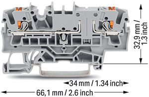 2-Leiter-Durchgangsklemme. mit Drücker. 2,5 mm². mit Prüfmöglichkeit. konturengleich zu 2-Leiter-Trennklemme. seitliche und mittige Beschriftung. für Tragschiene 35 x 15 und 35 x 7,5. Push-in CAGE CLAMP®. 2,50 mm². grau