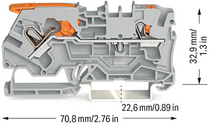 2-Leiter-Durchgangsklemme. mit Hebel und Drücker. 4 mm². mit Prüföffnung. seitliche und mittige Beschriftung. für Tragschiene 35 x 15 und 35 x 7,5. Push-in CAGE CLAMP®. 4,00 mm². grau