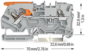 2-Leiter-Durchgangsklemme. mit Hebel und Push-in CAGE CLAMP®. 4 mm². mit Prüföffnung. seitliche und mittige Beschriftung. für Tragschiene 35 x 15 und 35 x 7,5. Push-in CAGE CLAMP®. 4,00 mm². grau