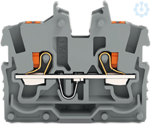 2-Leiter-Mini-Durchgangsklemme. mit Drücker. 1 mm². mit Prüföffnung. seitliche und mittige Beschriftung. Endklemme mit Befestigungsflansch. Push-in CAGE CLAMP®. 1,00 mm². grau