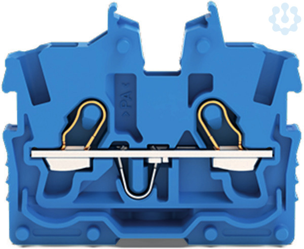 2-Leiter-Mini-Durchgangsklemme. mit Betätigungsöffnung. 1 mm². mit Prüföffnung. seitliche und mittige Beschriftung. Endklemme mit Befestigungsflansch. Push-in CAGE CLAMP®. 1,00 mm². blau