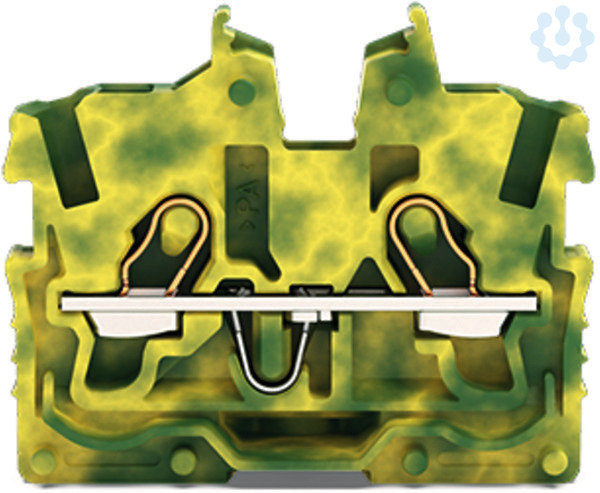 2-Leiter-Mini-Durchgangsklemme. mit Betätigungsöffnung. 1 mm². mit Prüföffnung. seitliche und mittige Beschriftung. Endklemme mit Befestigungsflansch. Push-in CAGE CLAMP®. 1,00 mm². grün-gelb