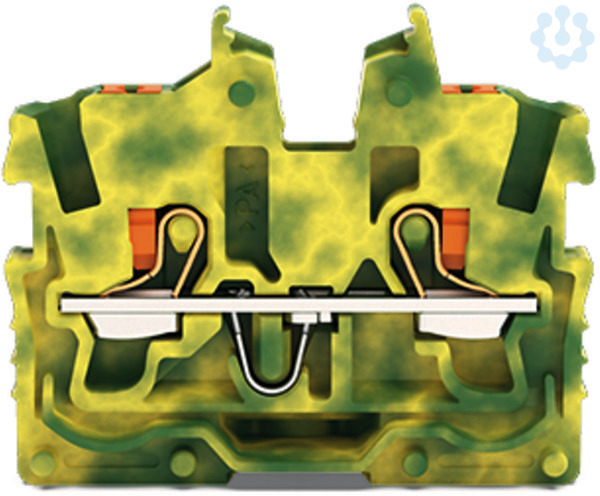 2-Leiter-Mini-Durchgangsklemme. mit Drücker. 1 mm². mit Prüföffnung. seitliche und mittige Beschriftung. Endklemme mit Befestigungsflansch. Push-in CAGE CLAMP®. 1,00 mm². grün-gelb
