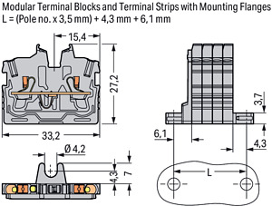 2-Leiter-Mini-Durchgangsklemme. mit Drücker. 1 mm². mit Prüföffnung. seitliche und mittige Beschriftung. Endklemme mit Befestigungsflansch. Push-in CAGE CLAMP®. 1,00 mm². grün-gelb
