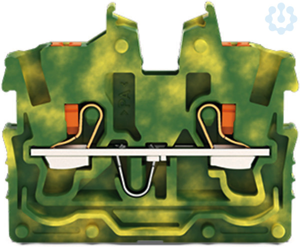 2-Leiter-Mini-Durchgangsklemme. mit Drücker. 1 mm². mit Prüföffnung. seitliche und mittige Beschriftung. Mittelklemme ohne Rastfuß, ohne Flansch. Push-in CAGE CLAMP®. 1,00 mm². grün-gelb