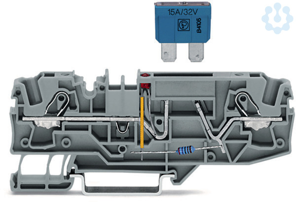 2-Leiter-Sicherungsklemme. für Kfz-Flachsicherungen. mit Prüfmöglichkeit. mit Defektanzeige durch LED. 48 V. für Tragschiene 35 x 15 und 35 x 7,5. 6 mm². Push-in CAGE CLAMP®. 6,00 mm². grau