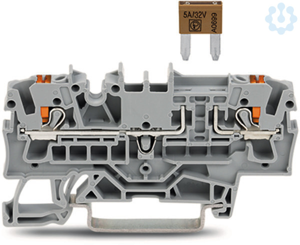 2-Leiter-Sicherungsklemme. für Kfz-Mini-Flachsicherungen. gemäß DIN 7258-3f, ISO 8820-3. mit Prüfmöglichkeit. mit Drücker. ohne Defektanzeige. 2,5 mm². Push-in CAGE CLAMP®. 2,50 mm². grau