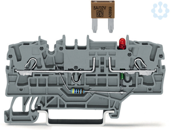 2-Leiter-Sicherungsklemme. für Kfz-Mini-Flachsicherungen. mit Prüfmöglichkeit. mit Defektanzeige durch LED. 24 V. für Tragschiene 35 x 15 und 35 x 7,5. 2,5 mm². Push-in CAGE CLAMP®. 2,50 mm². grau
