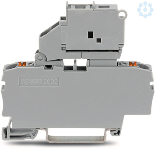 2-Leiter-Sicherungsklemme. mit schwenkbarem Sicherungshalter. und Abschlussplatte. für G-Sicherungseinsatz 5 x 20 mm. mit Drücker. ohne Defektanzeige. für Tragschiene 35 x 15 und 35 x 7,5. 2,5 mm². Push-in CAGE CLAMP®. 2,50 mm². grau