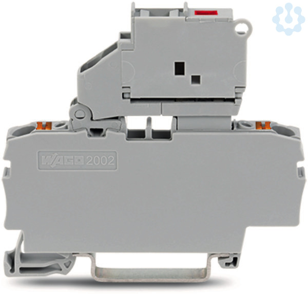 2-Leiter-Sicherungsklemme. mit schwenkbarem Sicherungshalter. mit Abschlussplatte. für G-Sicherungseinsatz 5 x 20 mm. mit Drücker. mit Defektanzeige durch LED. 12 - 30 V. für Tragschiene 35 x 15 und 35 x 7,5. 2,5 mm². Push-in CAGE CLAMP®. 2,50 mm². grau