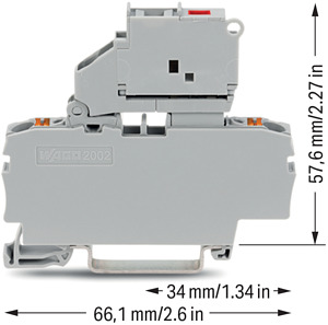 2-Leiter-Sicherungsklemme. mit schwenkbarem Sicherungshalter. mit Abschlussplatte. für G-Sicherungseinsatz 5 x 20 mm. mit Drücker. mit Defektanzeige durch LED. 120 V. für Tragschiene 35 x 15 und 35 x 7,5. 2,5 mm². Push-in CAGE CLAMP®. 2,50 mm². grau