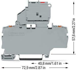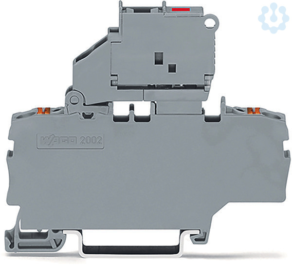 2-Leiter-Sicherungsklemme. mit schwenkbarem Sicherungshalter. mit zusätzlicher Brückung. für G-Sicherungseinsatz 5 x 20 mm. mit Drücker. mit Defektanzeige durch LED. 12 - 30 V. für Tragschiene 35 x 15 und 35 x 7,5. 2,5 mm². Push-in CAGE CLAMP®. 2,50 mm². grau