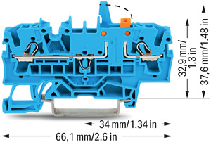 2-Leiter-Trenn- und Messklemme. mit mechanischer Verriegelung. mit Prüfmöglichkeit. Trennmesserhalter orange. für Tragschiene 35 x 15 und 35 x 7,5. 2,5 mm². Push-in CAGE CLAMP®. 2,50 mm². blau