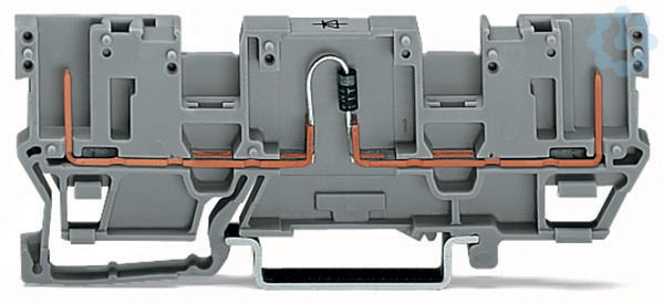 2-Pin-Bauelement-Basisklemme. mit 2-fach-Querbrückung. mit Diode 1N4007. Anode rechts. für Tragschiene 35 x 15 und 35 x 7,5. 4 mm². grau