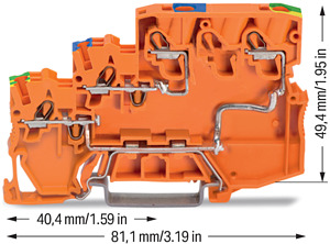 3-Leiter-Aktoreneinspeiseklemme. für PNP-(plus-)schaltende Aktoren. mit PE-Anschluss. mit farbig bedruckten Leitereinführungen. 2,5 mm². Push-in CAGE CLAMP®. 2,50 mm². orange