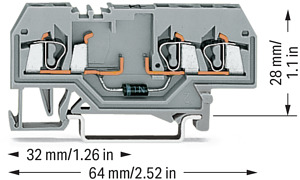 Bauelementklemme. 3 Leiter. mit Diode 1N4007. Anode rechts. für Tragschiene 35 x 15 und 35 x 7,5. 2,5 mm². CAGE CLAMP®. 2,50 mm². grau