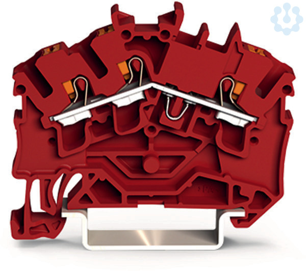 3-Leiter-Durchgangsklemme. mit Drücker. 2,5 mm². für Anwendungen Ex e II geeignet. seitliche und mittige Beschriftung. für Tragschiene 35 x 15 und 35 x 7,5. Push-in CAGE CLAMP®. 2,50 mm². rot