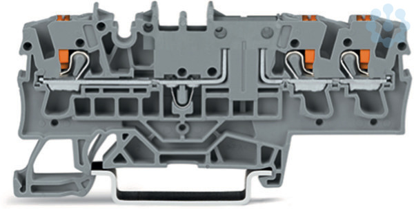 3-Leiter-Durchgangsklemme. mit Drücker. 2,5 mm². mit Prüfmöglichkeit. konturengleich zu 3-Leiter-Trennklemme. seitliche und mittige Beschriftung. für Tragschiene 35 x 15 und 35 x 7,5. Push-in CAGE CLAMP®. 2,50 mm². grau