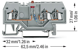 Bauelementklemme. 3 Leiter. LED rot. DC 24 V. für Tragschiene 35 x 15 und 35 x 7,5. 1,5 mm². CAGE CLAMP®. 1,50 mm². grau