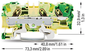 3-Leiter-Schutzleiterklemme. 6 mm². für Anwendungen Ex e II geeignet. seitliche und mittige Beschriftung. für Tragschiene 35 x 15 und 35 x 7,5. Push-in CAGE CLAMP®. 6,00 mm². grün-gelb