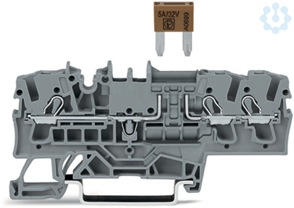 3-Leiter-Sicherungsklemme. für Kfz-Mini-Flachsicherungen. gemäß DIN 7258-3f, ISO 8820-3. mit Prüfmöglichkeit. ohne Defektanzeige. 2,5 mm². Push-in CAGE CLAMP®. 2,50 mm². grau