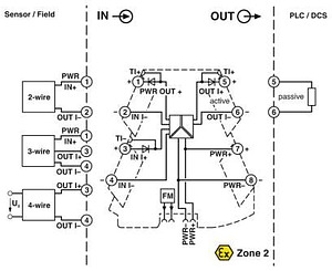3-Wege-Speisetrenner mit steckbarer Anschlusstechnik. HART-Transparent, Eingangssignal 0(4)...20 mA, Ausgangssignal 0(4)...20 mA. Das Gerät lässt sich sowohl im Trenner- als auch im Speisetrennerbetrieb verwenden. Push-in-Anschlusstechnik
