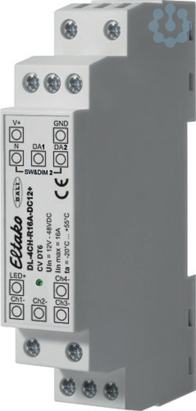 4-Kanal DALI-LED-Dimmer für Tragschiene DIN-EN 60715 TH35. 98x17,5x56mm. Schutzart IP20. Stand-by-Verlust nur 0,12 Watt. Geeignet zum Ansteuern von Konstantspannungs-LED-Modulen (CV) mit Betriebsspannungen von 12V bis 48V. Betriebsart DT6: separate Ansteuerung der Kanäle über 4 DALI-Adressen. Betriebsart Colour&Dim: Ansteuerung über 2 DALI-Adressen, eine zum Verstellen der Helligkeit und eine zum Verstellen der Farbe. SwitchDim2: Betrieb über 2 Tastereingänge ermöglicht Steuerung von Helligkeit und Farbe ohne DALI. Dimmbereich 0.1%-100%. Umschaltbare PWM-Frequenz (122Hz/244Hz/488Hz/976Hz). Versorgungsspannung von 12V bis 48V DC (entsprechend der Betriebsspannung der LED-Module). Anschlussstrom 16A. Der maximale Anschlussstrom kann beliebig auf die Kanäle verteilt werden. Hoher Wirkungsgrad. Konfiguration über PC-Software DALI-Cockpit und DALI-USB Interface. Betriebsarten: Das Gerät verfügt über mehrere Betriebsarten: DT6 (Auslieferzustand): In dieser Betriebsart wird jeder Kanal über eine separate DALI-Adress