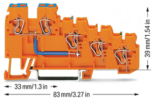 4-Leiter-Initiatoreneinspeiseklemme. Interne Brückung, 9 A. mit farbig bedruckten Leitereinführungen. 2,5 mm². CAGE CLAMP®. 2,50 mm². orange