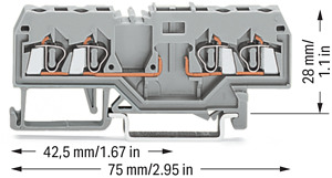 4-Leiter-Basisklemme. für Tragschiene 35 x 15 und 35 x 7,5. 2,5 mm². CAGE CLAMP®. 2,50 mm². grau