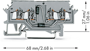 Bauelementklemme. 4 Leiter. für Lampenprüfschaltungen bis 60 V. mit 2 Dioden 1N4007. Anoden rechts. für Tragschiene 35 x 15 und 35 x 7,5. 1,5 mm². CAGE CLAMP®. 1,50 mm². grau