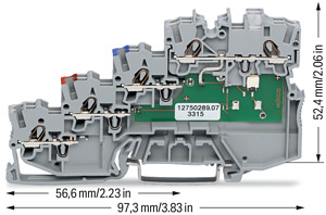 4-Leiter-Initiatorenklemme. LED gelb. für PNP-(plus-)schaltende Initiatoren. mit PE über Kammbrücker. 1 mm². Push-in CAGE CLAMP®. 1,00 mm². grau
