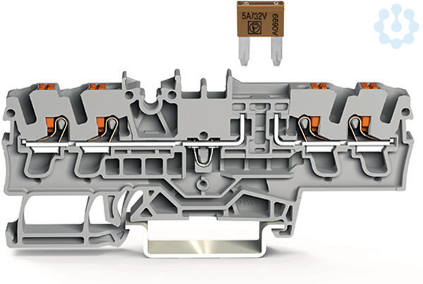 4-Leiter-Sicherungsklemme. für Kfz-Mini-Flachsicherungen. gemäß DIN 7258-3f, ISO 8820-3. mit Prüfmöglichkeit. mit Drücker. ohne Defektanzeige. 2,5 mm². Push-in CAGE CLAMP®. 2,50 mm². grau