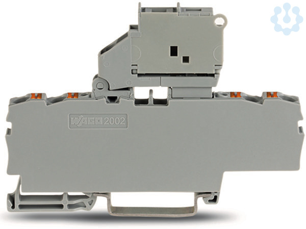 4-Leiter-Sicherungsklemme. mit schwenkbarem Sicherungshalter. und Abschlussplatte. für G-Sicherungseinsatz 5 x 20 mm. mit Drücker. ohne Defektanzeige. für Tragschiene 35 x 15 und 35 x 7,5. 2,5 mm². Push-in CAGE CLAMP®. 2,50 mm². grau