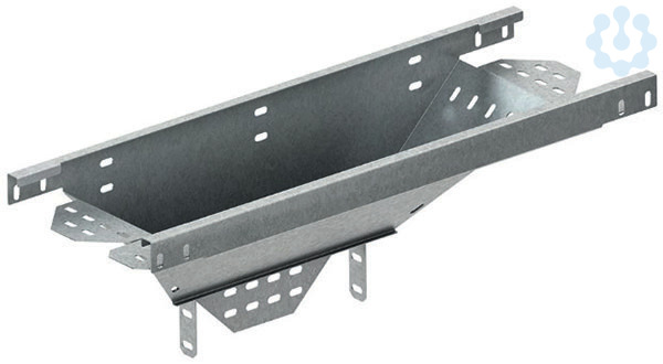 Abgangstrichter, längs, zweiteilig, mit ungelochten Seitenholmen, mit Verbinderlochungen für den Anschluss, mit integrierten Stoßstellenverbindern, für den senkrechten Abzweig längs zur Hauptrichtung, einschließlich anteilmäßigen Befestigungszubehör. Der Grundköper des Abgangstrichters wird auf die gerollten Längskanten der bereits vormontierten Kabelrinnen eingehangen und mit diesen verschraubt. Nach Einlegen der Kabel wird das Vorderteil an dem Grundkörper befestigt und mit den Kabelrinnen verschraubt. Vorteil des Trichters - Fädelaufwand der Kabel entfällt.