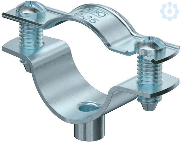 Abstandschelle zur Montage von Rohren und Kabeln an Wand, Decke und Boden. Mit selbstsicherndem Oberteil. Befestigung über Ansatz mit Innengewinde. Oberflächen G und FT ab Schellengröße 20 geeignet für Montage mit Nagelgerät oder Bolzensetzgerät. Zugelassen für den Funktionserhalt nach DIN 4102 Teil 12, Funktionserhaltklassen E 30 bis E 90.