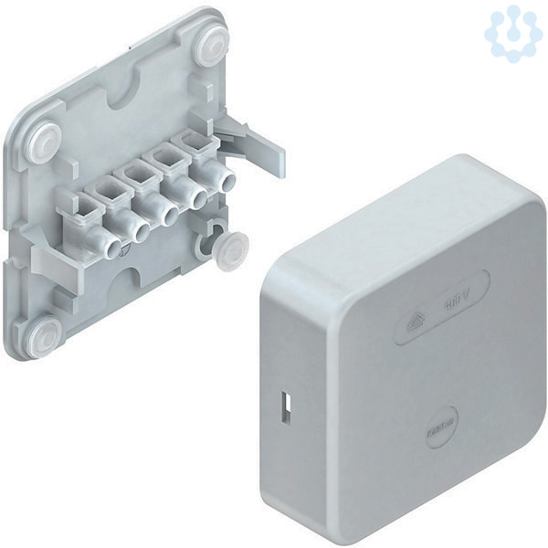Abzweigdose, mit Deckel und einer 5-poligen Verbindungsklemme 2,5 mm² sowie Isolierkäppchen zur Abdeckung der zur Befestigung verwendeten Schraubenköpfe, mit 7 ausbrechbaren Leitungseinführungen in der Abdeckung (4x Ø17 x 19,5 mm und 3x Ø19,5 x 22 mm), zur Aufputzmontage in trockenen Innenräumen, halogenfrei. Abmessungen (ca. Maße) H x B x L