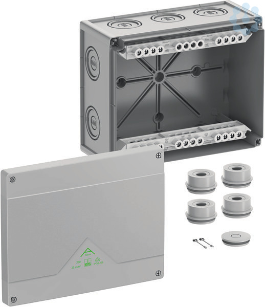 Abzweigkasten, mit Schutzart IP55/IP66, Nennquerschnitt 25mm², zertifiziert durch VDE (DIN EN 60670-1/-22 (VDE 0606-1/-22)), DLG (Ammoniakbeständigkeit), Ausschlagmembranen, M20/M25/M40/M50, (4 rückseitig, 10 seitlich), innenliegende Befestigungsstellen, für Standardinstallationen im Innenbereich und geschütztem Außenbereich, grau, Ui=690 V AC, In=101 A, mit hochliegender Schraubklemme, 5-polig-25mm², klemmbare Querschnitte pro Pol: 12 x 10mm², 8 x 16mm², 4 x 25mm² Cu starr / flexibel mit AderendhülseAbmessungen: 252 x 202 x 120mmBeigefügtes Zubehör: 4 Anbaustutzen IP55 M40 Dichtbereich 17-30mm, 1 Verschlussstopfen IP55 M40, Deckelverliersicherung
