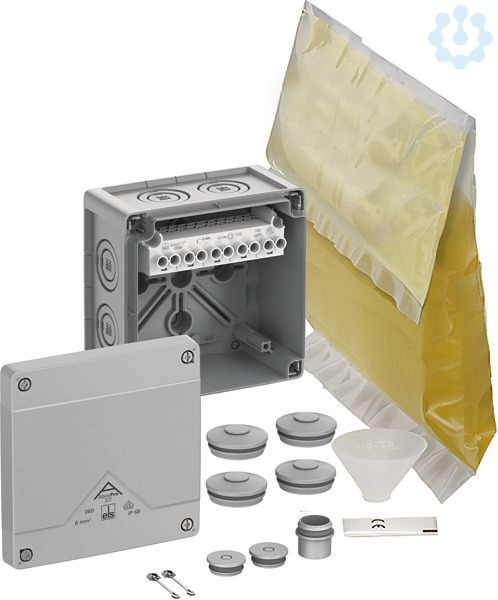 Abzweigkasten, mit Schutzart IP68, Nennquerschnitt 6mm², Ui=690 V AC, zertifiziert durch VDE (DIN EN 60670-1/-22 (VDE 0606-1/-22) & DIN VDE V 0606-22-100), Ausschlagmembranen, M20/M32, (1 rückseitig, 7 seitlich), innenliegende Befestigungsstellen, mit Schraubklemmen zum Vergießen, zur Montage in Überschwemmungsgebieten und im Erdreich ohne Verkehrslasten für Installationen im industriellen Umfeld und ungeschütztem Außenbereich, grau, In=41 A, mit hochliegender Schraubklemme, 5-polig-6mm², klemmbare Querschnitte pro Pol: 4 x 1,5mm², 4 x 2,5mm², 4 x 4mm², 4 x 6mm² Cu starr / flexibel mit AderendhülseAbmessungen: 127 x 127 x 75mmBeigefügtes Zubehör: 4 Doppelmembranstutzen IP66 M32 Dichtbereich 13-21mm, 2 Verschlusstopfen M20, 1 Anbaustutzen M20,