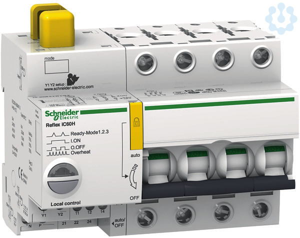 Fernschaltbarer Leitungsschutzschalter Acti 9 Reflex iC60H, Ausschaltvermögen 30kA bei 220-240V AC (EN/IEC 60947-2), 15kA bei 380-415V AC (EN/IEC 60947-2). 4-polig, Nennstrom 25A, D-Charakteristik, Ti24-Schnittstelle, Isolationsspannung (Ui) 500V. Fernschaltung mittels Impuls und/oder Dauersignal entsprechend einem der drei einstellbaren Betriebsarten durch den Anwender. Schützen von Stromkreisen gegen Kurzschlussströme. Schützen von Stromkreisen gegen Überlastströme. Trennen von Stromkreisen. Mit Ti24 Anschluss für die direkte Anbindung an SPS oder dezentrale E/A. Bistabiler Schaltmechanismus benötigt keine Halteleistung. Grüne Anzeige am Schalter garantiert, dass die Kontakte geöffnet sind und ein sicheres Arbeiten auf der Abgangsseite gewährleistet wird. Sprungschaltung garantiert verschleißarmes Schalten der Kontakte. Anzeigeleuchte des Betriebszustandes. Steuerung durch drei einstellbare Betriebsarten anhand des Drucktasters auf der Gerätefrontseite möglich. Schutzart IP20. Zur Steuerung der Eingänge Y1